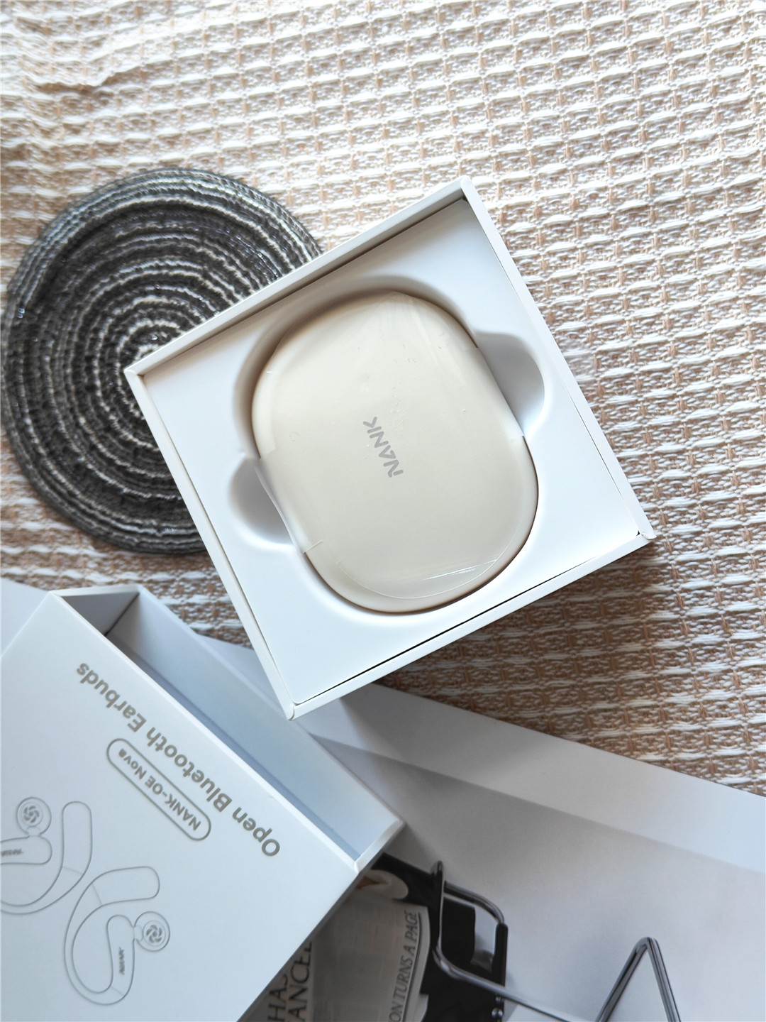 拆开快递箱的瞬间,南卡 OE Nova 的外包装就给了我第一个惊喜。采用了抽屉式的硬纸盒设计,包装盒以白色为底色,烫银工艺勾勒出耳机的线条图,左上角印有品牌 Logo,低调却有质感,拿在手里像很有质感。