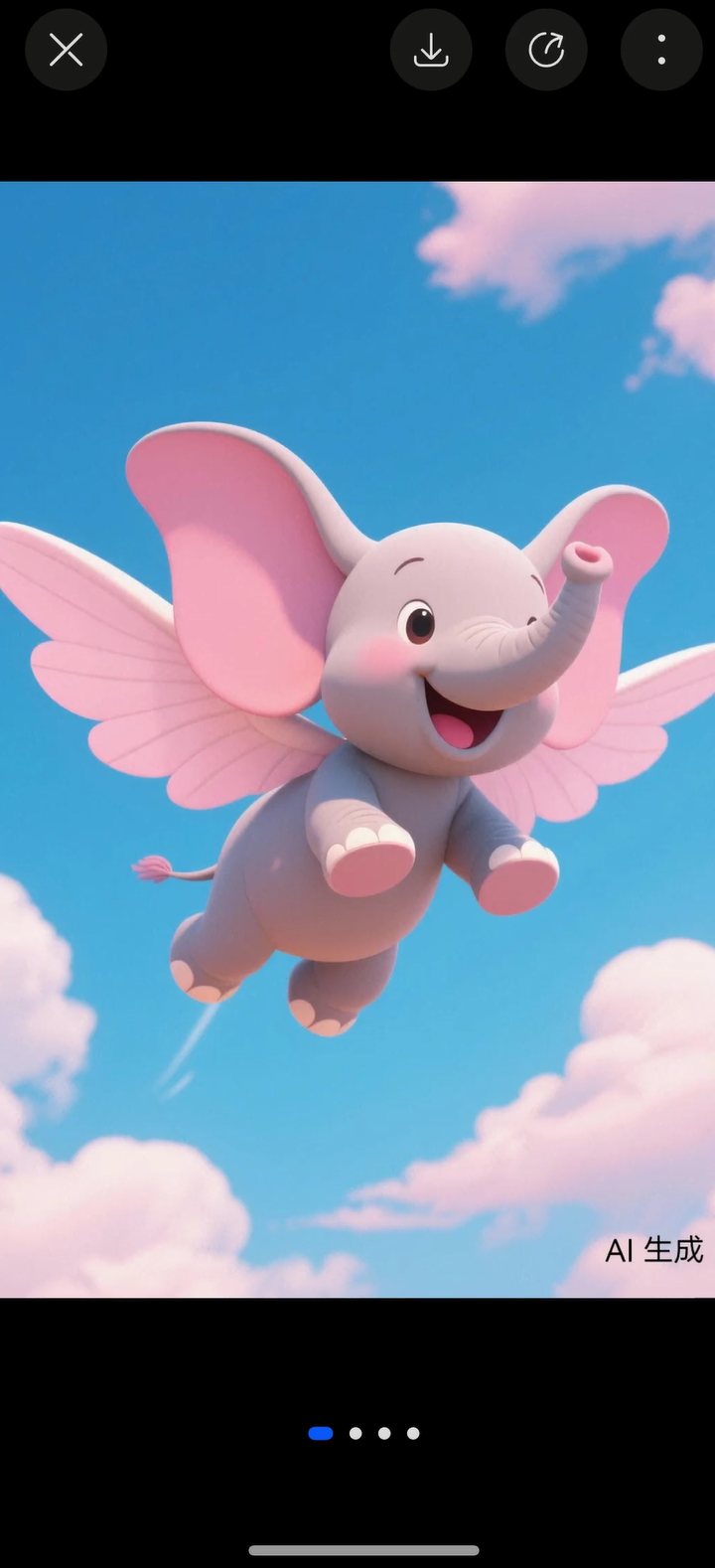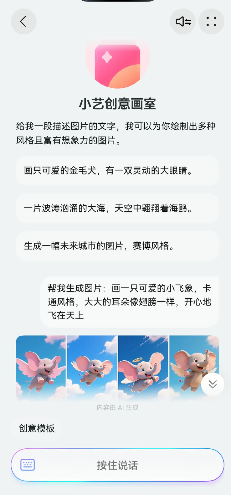 就拿上周教“elephant”来说,课本插图很普通,网图也只是大象的日常照片。于是我打开小艺App,开启小艺创意画室Agent,对TA说:“画一只可爱的小飞象,卡通风格,大大的耳朵像翅膀一样,开心地飞在天上。”