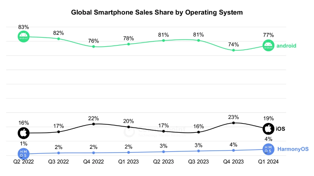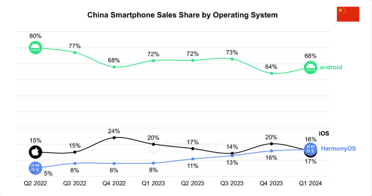 根据Counterpoint Research发布的最新报告,在中国市场,华为鸿蒙的份额由2023年第一季度的8%上涨至2024年一季度的17%。