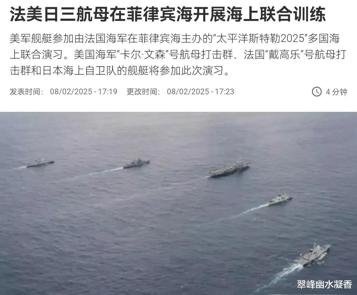 朋友们,咱们今天不谈那些虚头巴脑的,就聊聊最近南海这片水域上翻腾的浪头。美、法、日这三个老哥,好家伙,航母都开到亚太来了,摆明了要搞个“太平洋斯特勒-2025”联合军演,冲着咱们来的意思,再明显不过。这架势,看着就让人心里咯噔一下,是不是?