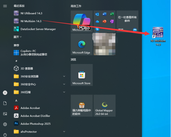 19、点击电脑桌面左下角的开始按钮,找到刚刚安装的【NI Multisim 14.3】软件,鼠标左键按住不放,拖拽到电脑桌面。