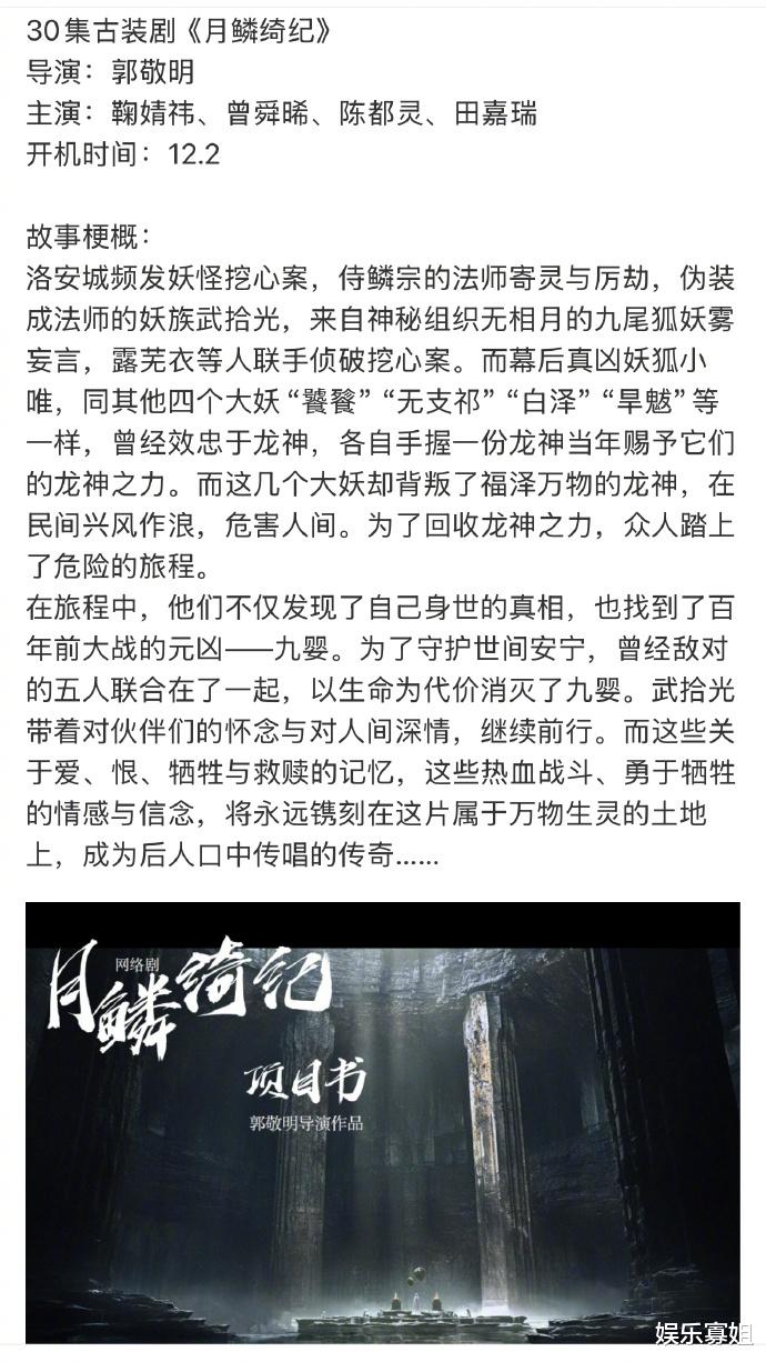 嗨!这里是娱乐寡姐,为你带来最新娱乐资讯。郭敬明新剧《月鳞绮纪》(画皮)明日开机,该剧可谓众星云集,由鞠婧祎、曾舜晞、陈都灵、田嘉瑞等主演,都是天选古人,如此众多的俊男美女齐聚一堂,光是想象就觉得很是养眼。已经迫不及待期待开机啦!