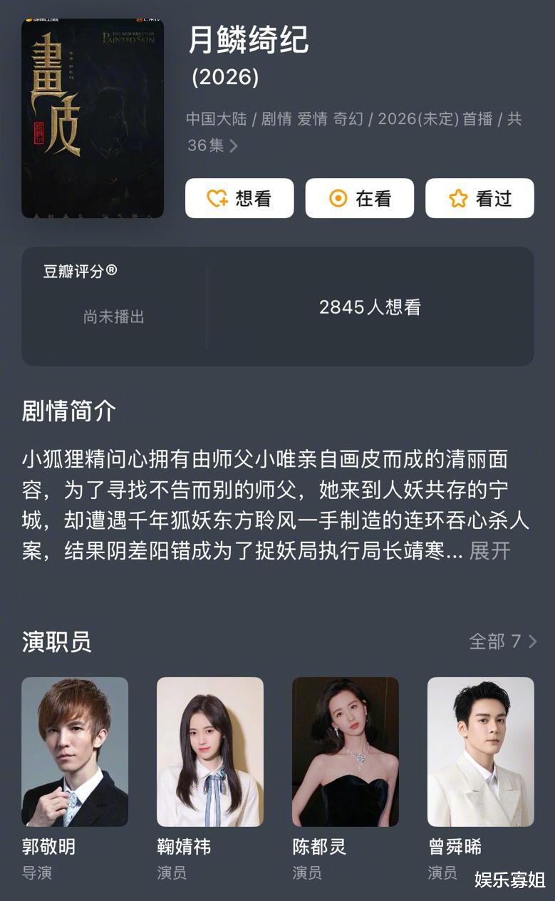 据悉,《月鳞绮纪》(画皮)古装奇幻题材,由郭敬明执导,鞠婧祎、曾舜晞、陈都灵、田嘉瑞、夏之光、欧米德等人联袂主演。