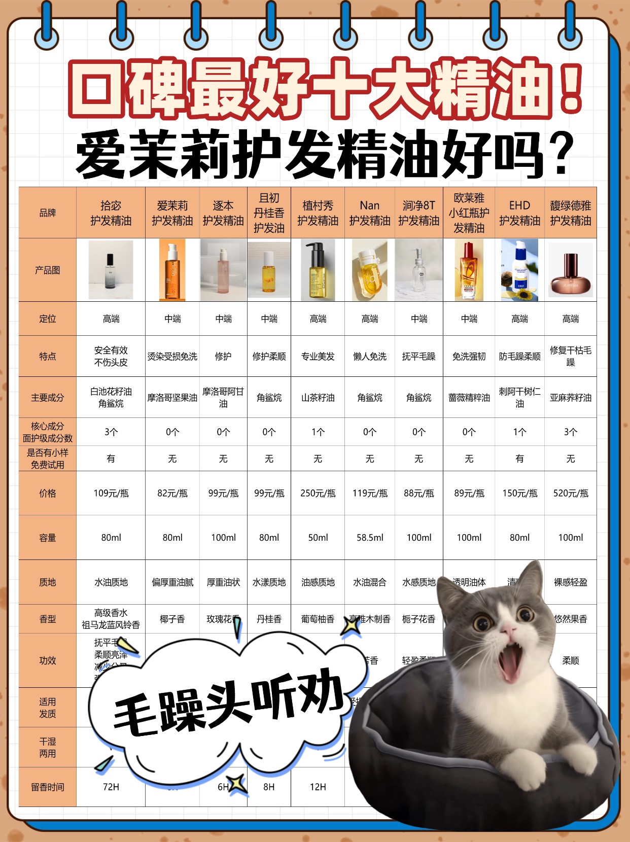很多人问爱茉莉护发精油相关的问题,其实核心还是大家都关心的:护发精油会不会让头发变油?还有如何判断精油好坏?先说第一个问题,精油本身不会让头发变油,变油都是因为用错了!比如涂到发根、用量太多,或者选了质地厚重的精油,适合自己发质的精油涂完是清爽顺滑的,不会有油腻感。再说说怎么判断精油好坏,首先看成分表,排在前面的要是天然植物油,比如摩洛哥坚果油、角鲨烷这些,避开矿物油、大量硅油的产品;然后看质地,好的精油流动性适中,搓开后吸收快,不会粘手;还有香味,自然淡雅的比刺鼻浓烈的好,太香的可能加了大量人工香精。另外可以试试涂完后头发的状态,能快速抚平毛躁,不粘腻、不结块的才靠谱。接下来分享我选购护发精油时的一些经验,想选到合适的一定要看完!