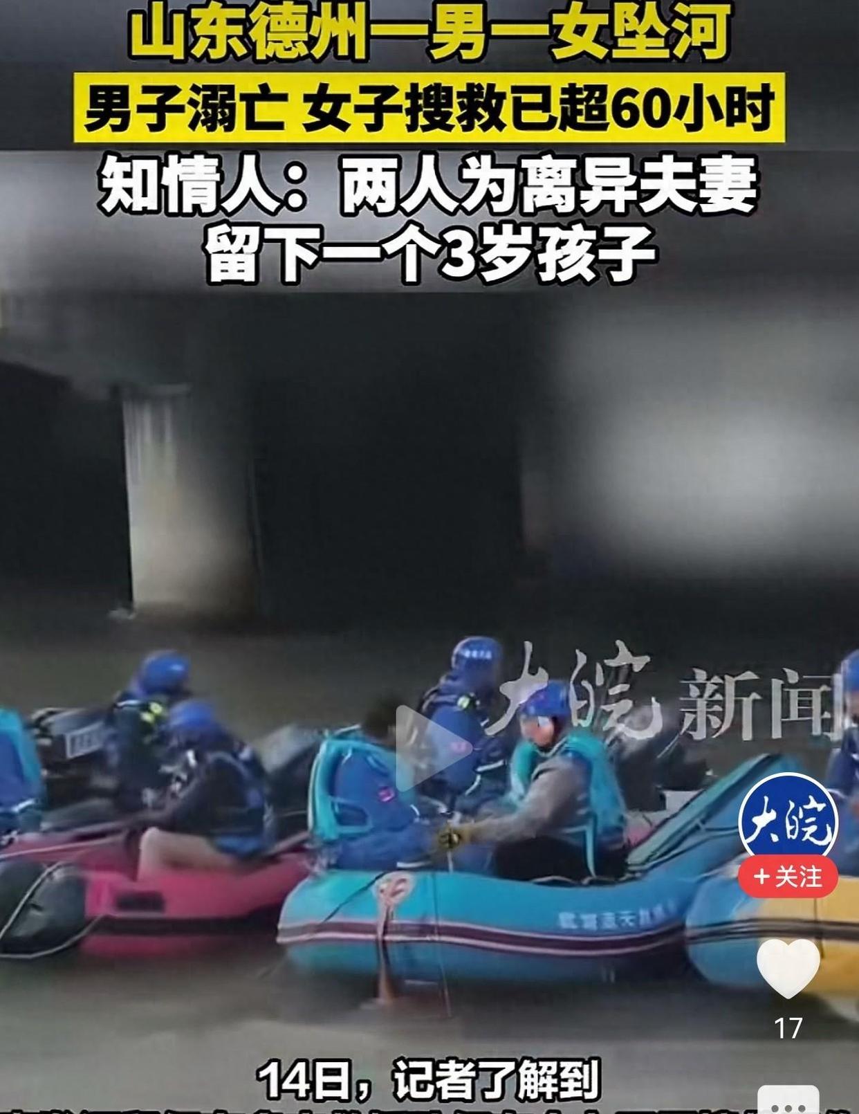 这次真是令人心碎的一场突发意外,11月12日有人上传视频,说在山东德州夏津县的一段河流里,夜里有一对年轻的男女掉水了。男子已经被打捞上来了,可还剩一位正在搜救中呢!