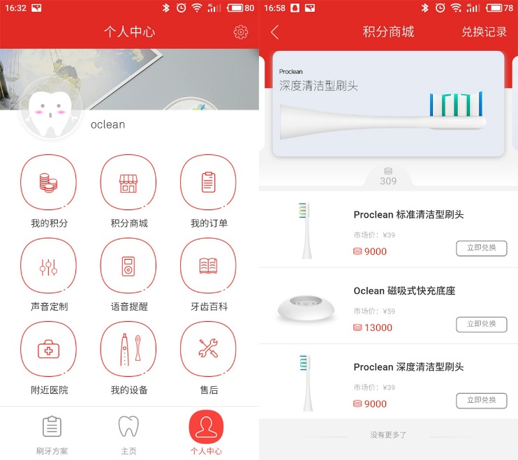 比较人性化的是APP提供了积分以及积分商城,积分会根据用户的使用时长、自动累计叠加,当积累到一定分数,用户就可以使用积分免费兑换刷头、充电底座等配件。