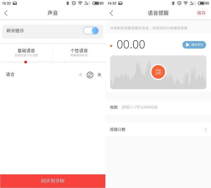 前面说到Oclean One智能牙刷内置了语音提醒功能,在每次开始、清洁模式切换时有语音说话提醒之余,不但可以选择明星个性语音、中英文语音,还能通过录制自己喜欢的语音提醒、设定语音提醒日期,给一个小小的电动牙刷更多的玩法。