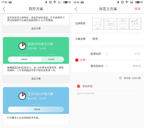 此外,用户还可以根据自己的喜好,对刷牙方案进行自定义,选用不同的刷牙时长、清洁模式、档位进行组合,让每个用户找到适合自的刷牙清洁方式,真的很人性化。