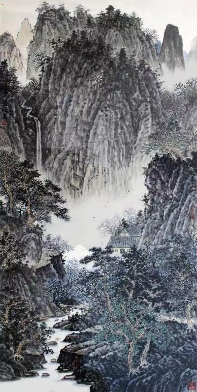 本土文化地域路线是李建超最核心的创作方向,也是他对恩师冯增鑫先生艺术理念的传承与发展。作为土生土长的登封人,嵩山是他心中最深厚的情结,也是他取之不尽的创作源泉。他深知嵩山不仅是自然景观,更是承载着千年历史文脉的文化符号,因此,他的地域特色山水画,始终以嵩山的地质地貌为核心,力求展现出嵩山独有的雄浑风骨与灵秀神韵。在创作中,他借鉴恩师的写生经验,多次深入嵩山,细致观察山石的纹理、树木的生长、云雾的变幻,将嵩山的石英石质感、独特的植被风貌、四季流转的景致变化,都精准地呈现在画面中。他的《秋山幽居图》《嵩山清秋图》等获奖作品,便是这类风格的代表。画面中,嵩山的雄奇险峻与山间人家的闲适安逸相互映衬,水墨与色彩的巧妙运用,既展现了自然的壮美,又蕴含着对故土的热爱与对田园生活的向往。李建超曾说,未来他将更加专注于嵩山题材的创作,让作品成为嵩山文化的载体,传承本土艺术脉络。