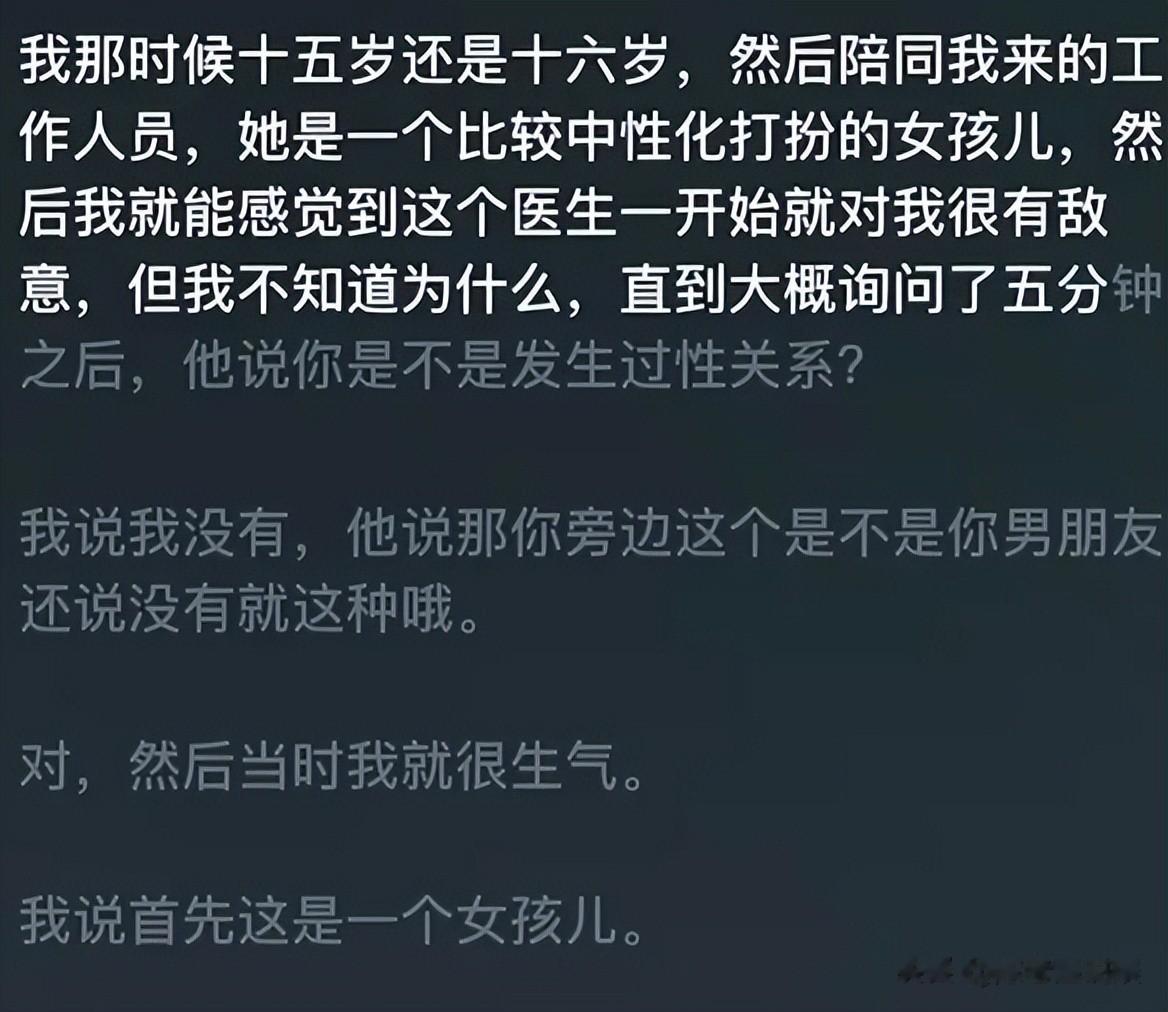 接诊的医生没有先询问她的病情,也没有安抚她紧张的情绪,一开口就直奔主题,语气尖锐地问她有没有过性关系。