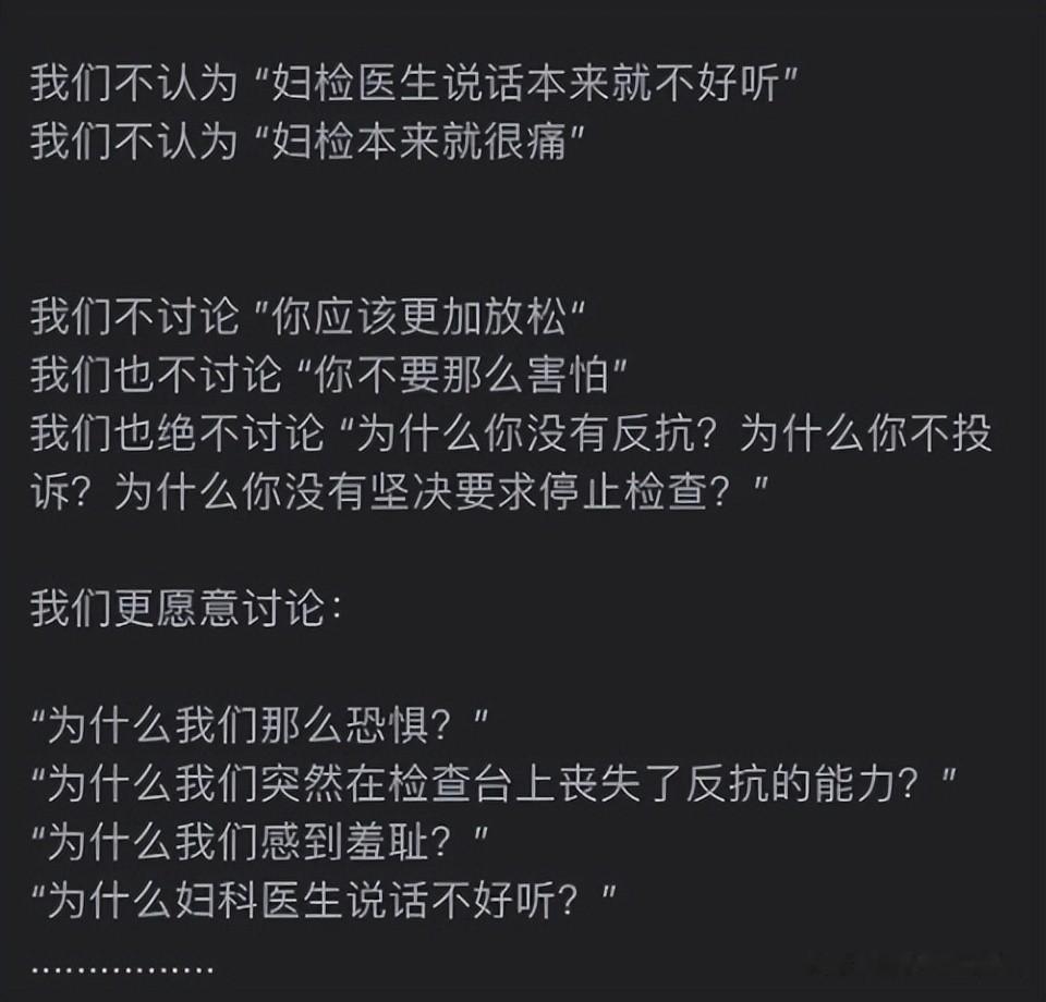 有人说自己做妇科检查时,也被医生冷言冷语训斥,有人说未经自己同意,就被实习生围观。