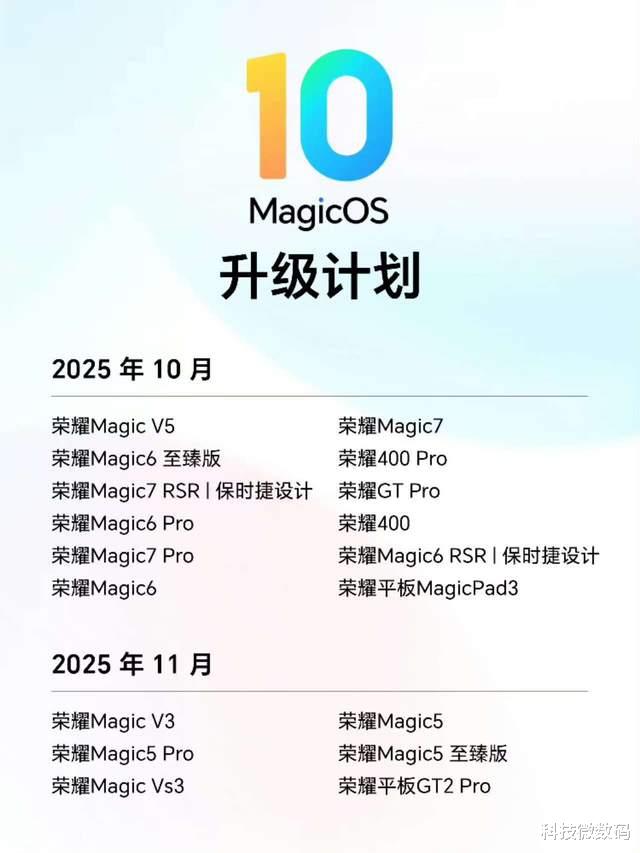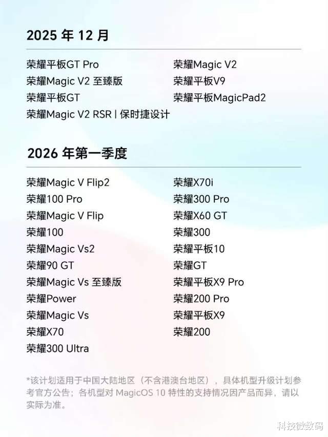此次新系统升级计划几乎涵盖了荣耀最近几年发布的大多数手机和平板机型,升级时间从2025年10月到2026年的第一季度。升级机型包括数字系列、Maic系列、X系列等。此次不在升级范围内的其他机型,后期应该也会陆续升级。