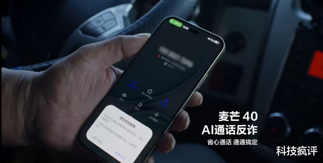 两人碰面后,"卡车猫王"王天军还在车上接到了一通诈骗电话,此时麦芒40通过内置的AI通话防诈,自动识别了潜在风险电话,并给用户弹出诈骗预警,让诈骗无处藏身,这项功能对于长辈来说相当实用。