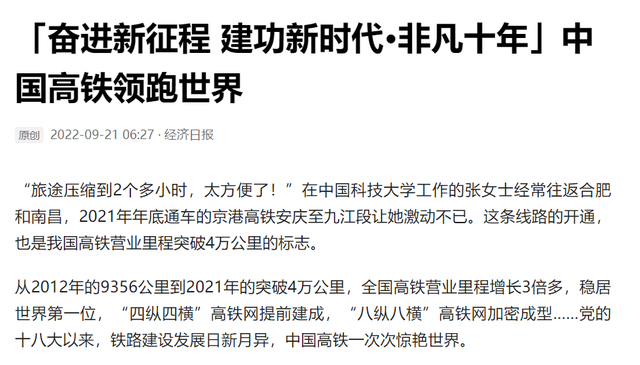 参考资料「奋进新征程 建功新时代·非凡十年」中国高铁领跑世界 经济日报