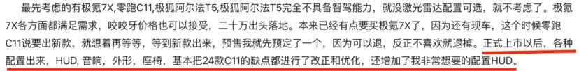 车主反馈:本来准备选极氪7X,各方面表现都符合预期,即便价格稍高,他也做好了“咬咬牙入手”的准备。但此时零跑C11改款的消息传来,改款车型在续航等核心配置上有明确提升,且预售阶段的订单可退,加上价格比极氪7X低好几万,他先订下了零跑全新C11,留作备选。