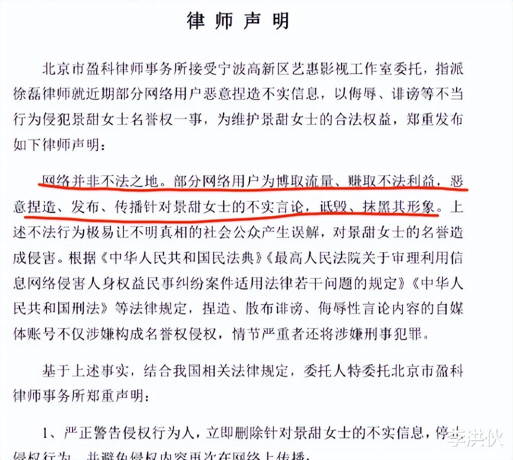 特别提到网络非法外之地,对在网络上恶意捏造不实言论,诋毁景甜形象的行为人,将提起法律诉讼。