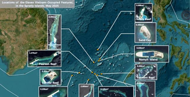 在诸多对中国海洋权益形成显著威胁的岛礁里,柏礁与大现礁的扩建潜力尤为引人注目。柏礁的礁坪面积相当可观,达50平方公里,当下其填海造陆面积已逼近2平方公里。大现礁的礁体全长13公里,礁盘总面积约24.8平方公里,其中礁坪面积约占20.7平方公里。目前,越南已在大现礁启动填海工程,造陆面积约0.65平方公里,按照其规划,未来该礁的填海造陆总面积将突破5平方公里。