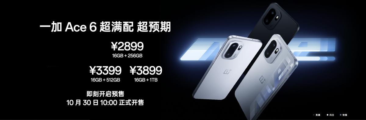 售价方面,一加Ace6 12GB+256GB 2599元,16GB+256GB 2899元,12GB+512GB 3099元,16GB+512GB 3399元,16GB+1TB 3899元。