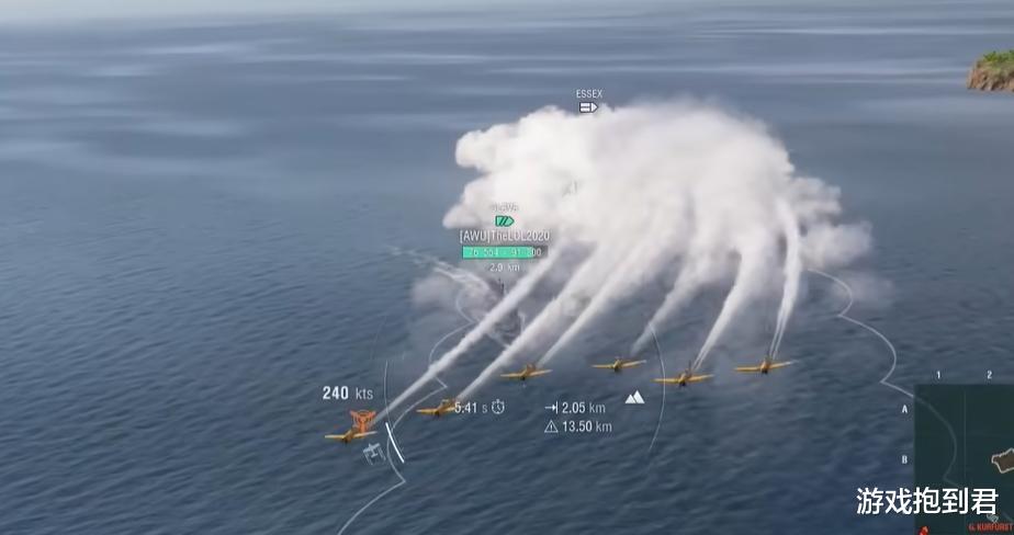 埃塞克斯的战术火箭机和轰炸机还配置了作用时间60秒的发烟器,烟雾扩散时间10秒,可为自身或友军提供关键掩护。在敌方航母视野压制时,可以通过拉烟保护鱼雷机返航,或协助巡洋舰脱离战列舰炮线,都能显著提升团队存活率。