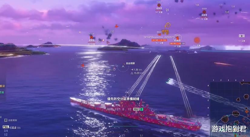 埃塞克斯的定位属于万金油型辅助航母。其双战术机组设计,能让玩家根据战场形势灵活切换输出模式。面对驱逐舰时,优先使用鱼雷机的高漏水系数制造进水伤害;对抗战列舰时,则依赖火箭机的12发投射量或轰炸机的3140点单发伤害进行破防。