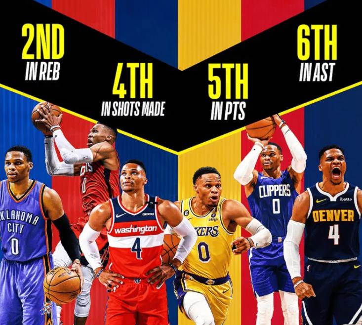 根据数据显示,威少在后卫数据榜中排名很高,分别是26205分,排在历史第五,8677个篮板,排在历史第二,9925个助攻,排在历史第六,Clutch Points说,这样曾经的MVP,9次全明星,依旧还在等待签约电话!