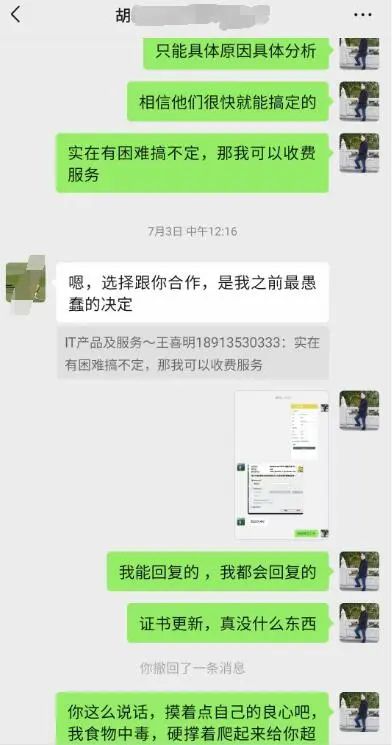 一提到收费,胡某人就跳起来了,说我没情义,说当初选择跟我合作是他最愚蠢的决定。