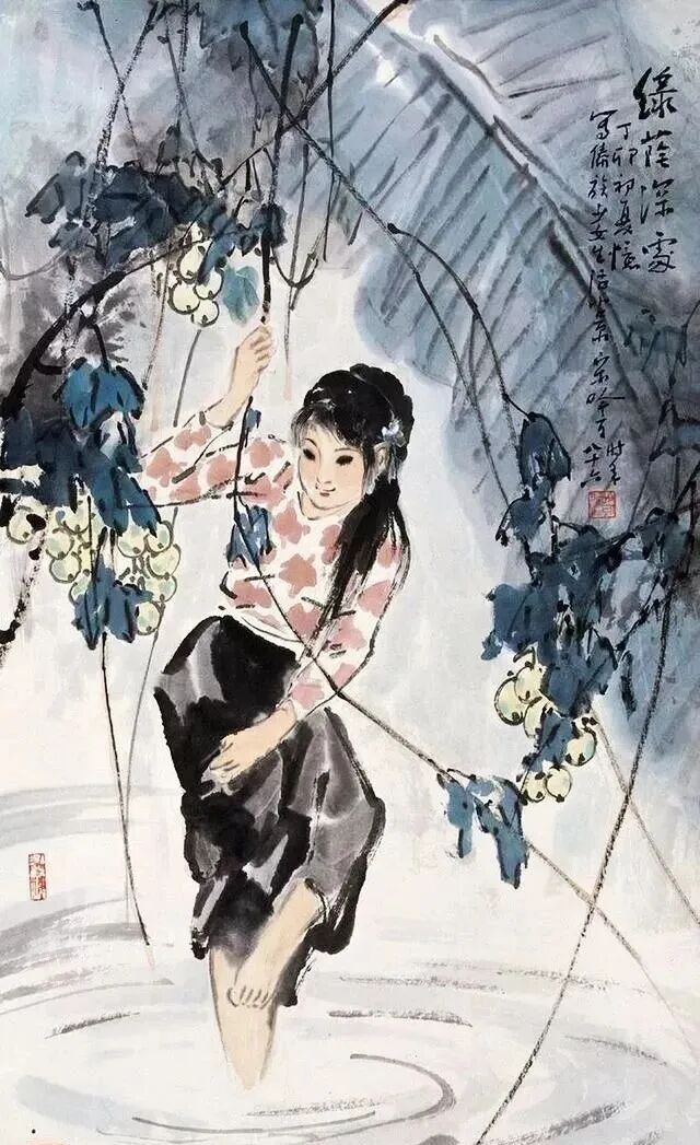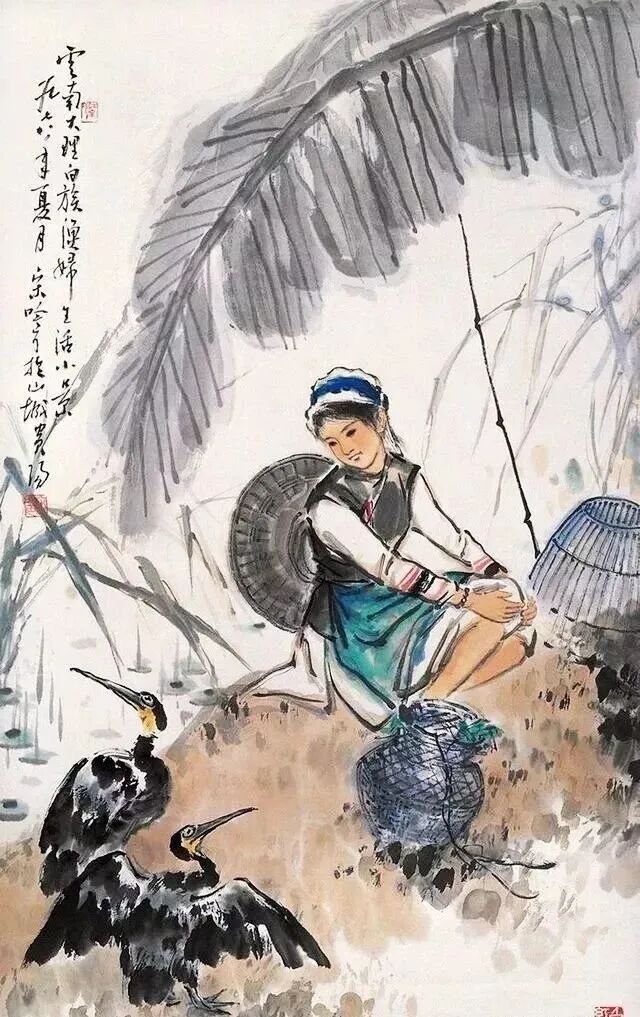 设色清新,避浓避俗。花青为主,石绿相佐,加以胭脂、赭石。色在墨上,如露凝叶;墨在色间,如泉润土。要处一抹明光,如鸟喙一点朱,发饰一丝红,或器物轻金,足以统摄全局。水面多以淡墨横拖,回笔圈成细浪;石岸偶施干擦,肌理隐现。墨分五色,层层渍染,清润二字,由此得来。