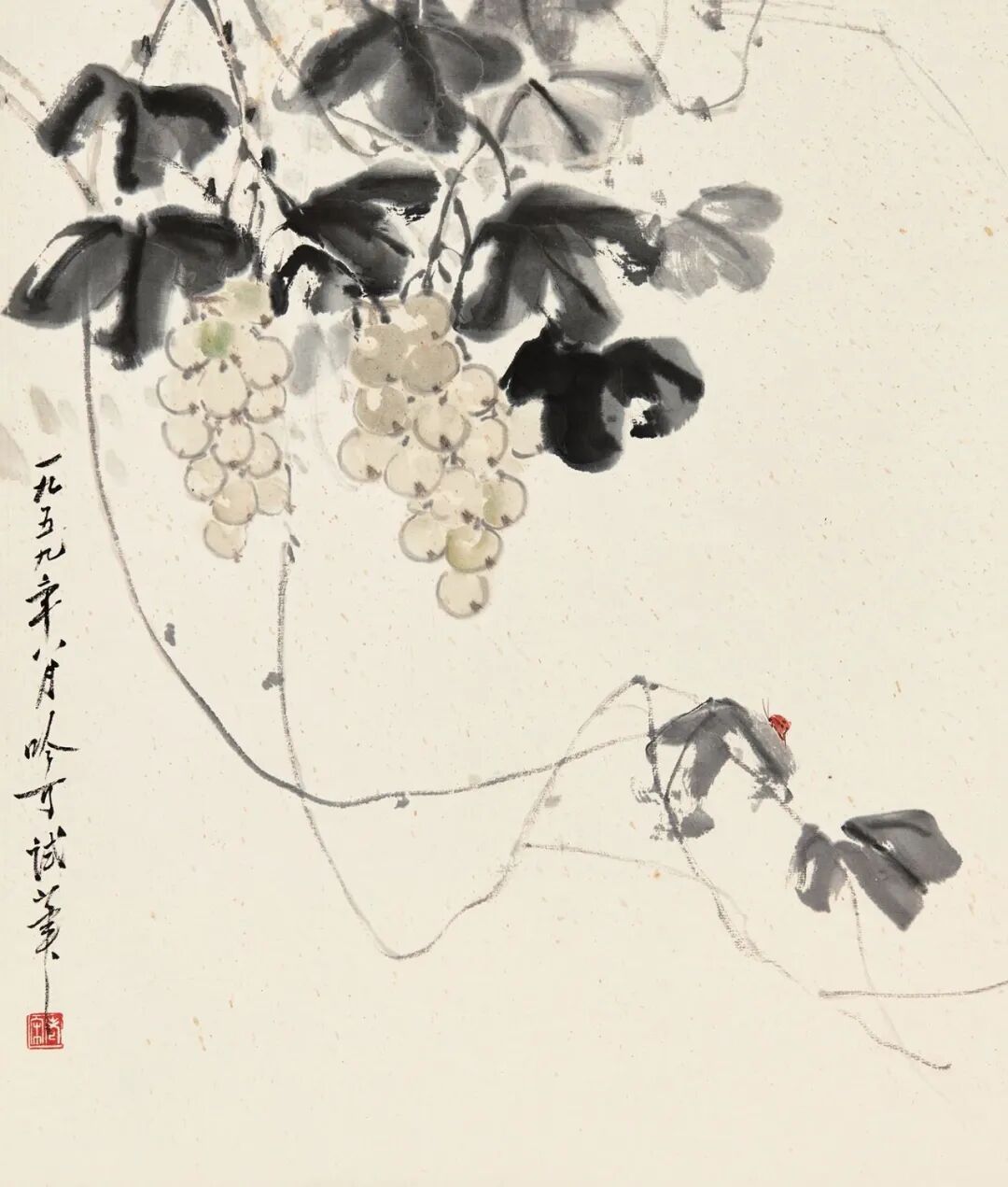 笔法不躁,线如清丝。中锋入纸,转折含筋,枯湿相参。细枝细蔓,若风中细语;衣纹器物,落笔果断,气骨自立。款识安帖,字势与枝叶相谐,章法有度,书与画相依。近视之,飞白若雪,墨痕如岚;远望之,气韵成林,风神自远。