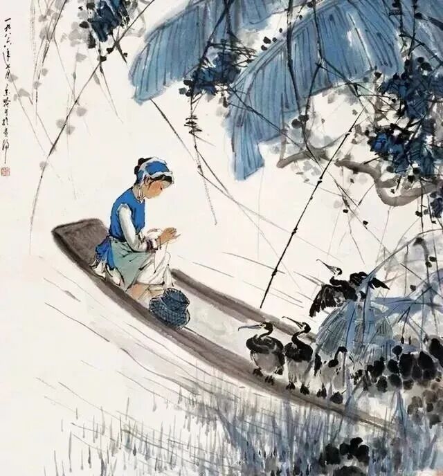 构图多用斜势。竹枝斜挑,藤蔓斜垂,舟身斜渡,岸线斜出,动感生焉。留白为气口,大块清空,托出静与远。疏密分段,密处如云聚,疏处似风开;上下相望,上为叶幕,下为水天,中间一人一禽,恰得中和。观者目随枝叶而行,由斜入,由白定,由细节停,心路安稳。