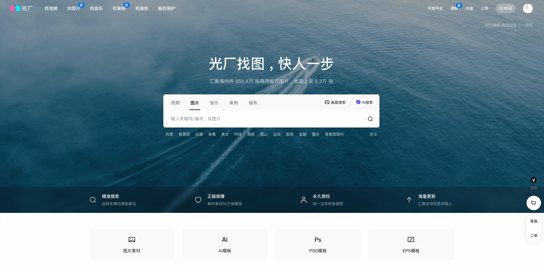 1. 光厂(f.vjshi.com):国内AI图片素材的“全能选手”网站背景与资源库:光厂(作为国内领先的数字创意平台,已汇聚超545万张商用版权图片,其中AI生成图片占比超30%,每周新增3.4万张。其资源库覆盖“天空”“城市”“科技”“自然”等热门分类,更支持AI搜索功能——输入“赛博朋克风格咖啡馆”,3秒内即可获取多组4K画质素材。