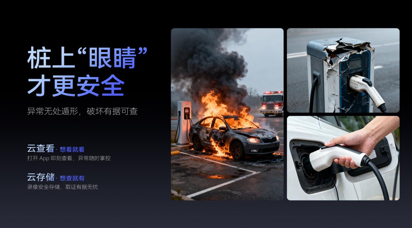 另外,能效电气天曜WE P7 Mega将“桩上眼睛”理念融入设计,通过内置高清摄像头实现从“盲桩”到“明桩”的跨越。桩体集成200万高清镜头,结合专业级影像调校,为车位提供全方位的安防监控。150°大广角镜头减少监控盲区,AI算法支持火灾、破坏、强拔枪线等异常事件自动识别并触发云存储,用户可通过App实时查看或回放录像,形成全链路守护。