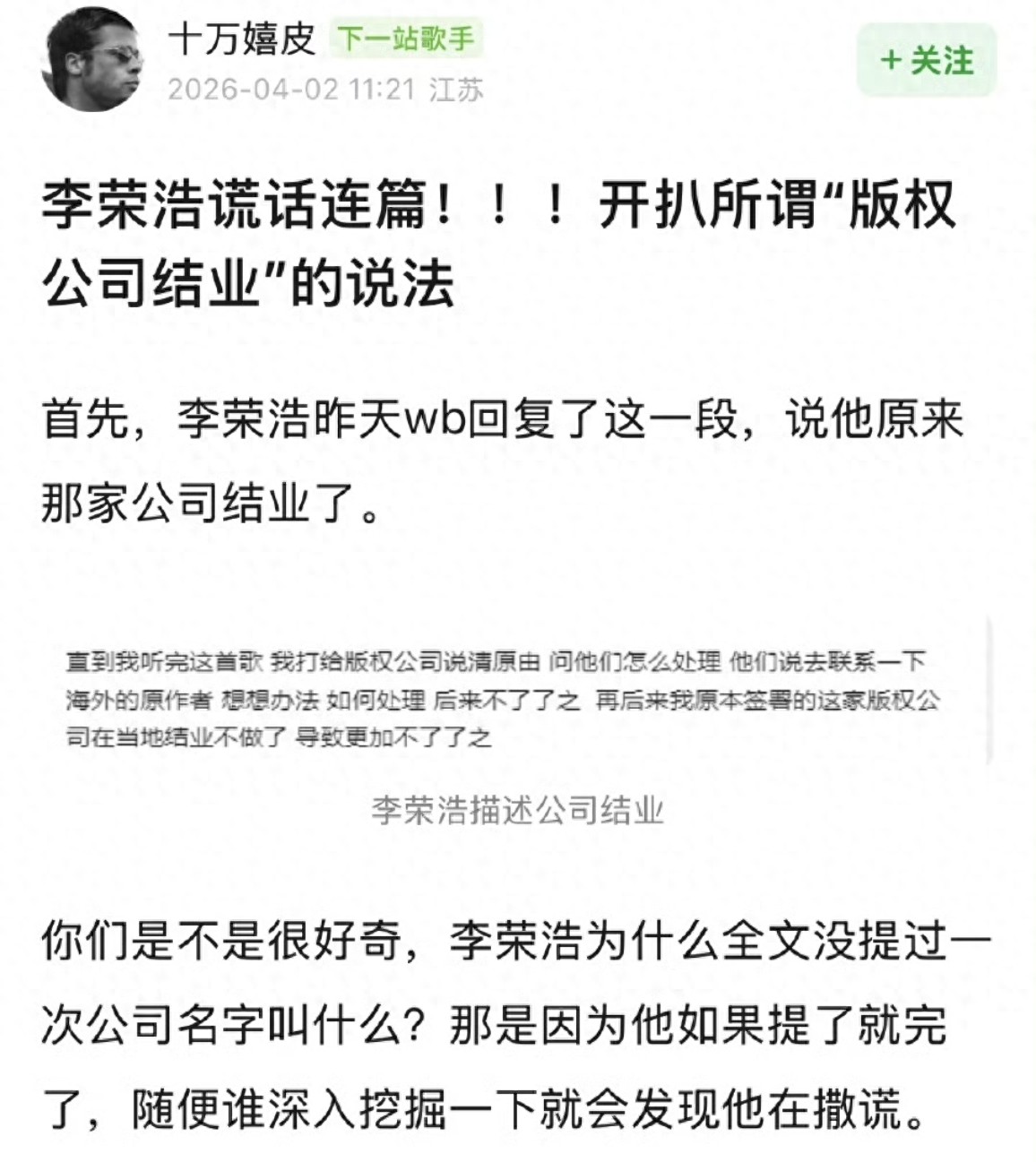 从"维权斗士"到"被维权对象",只需要一个热搜的距离,事情是这样的:前几天李荣浩刚硬刚完单依纯,义正言辞地晒出音著协邮件,四连质问"用什么立场、什么权利、什么角度、什么心态"唱《李白》。网友们纷纷点赞:"浩哥真刚!""内娱版权卫士上线了!"