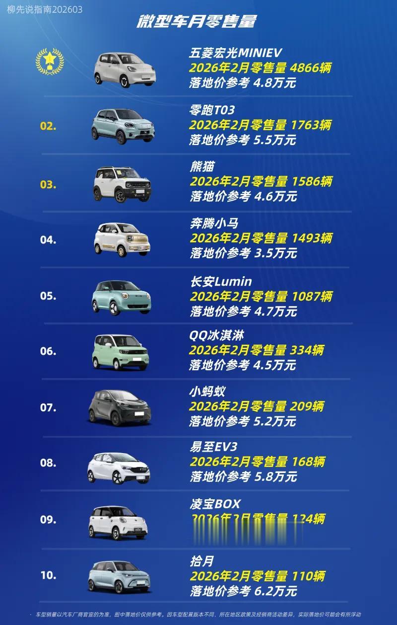 从2026年2月的销量数据来看,微型车市场销量前三甲分别为五菱宏光MINIEV、零跑T03以及吉利熊猫。稳居榜首位置的五菱宏光MINIEV,月零售量达4866辆。自上市以来就备受消费者青睐,是微型车市场的现象级产品,宏光MINIEV家族累计销量已破了190万辆。