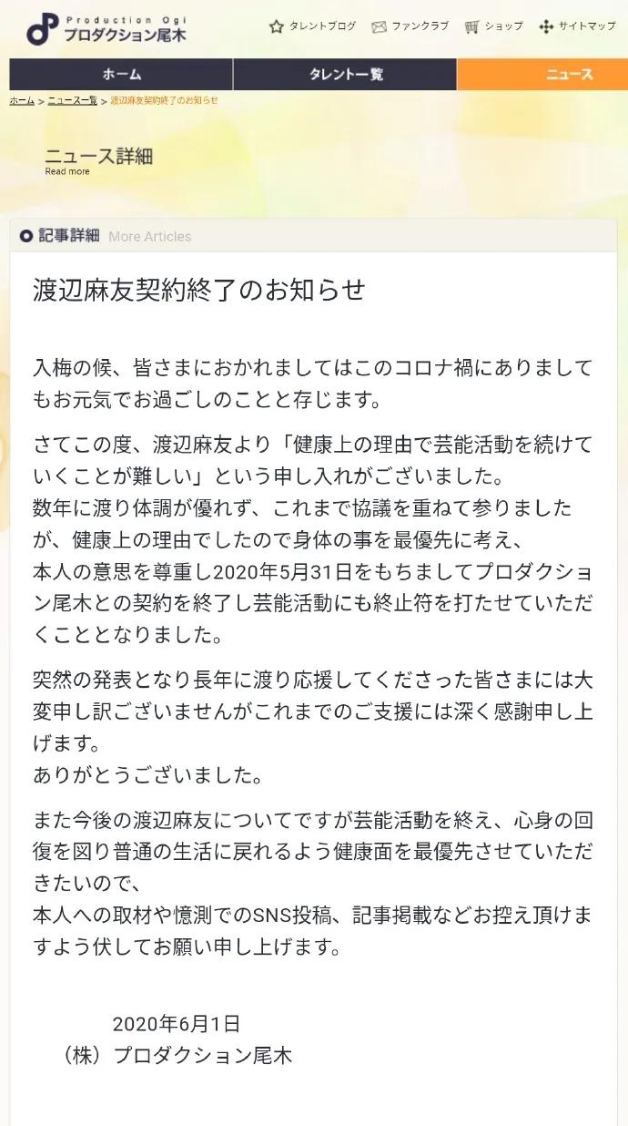 艺能事务所尾木制作官网发布公告,与渡边麻友的经纪合约结束,她正式退出演艺圈。