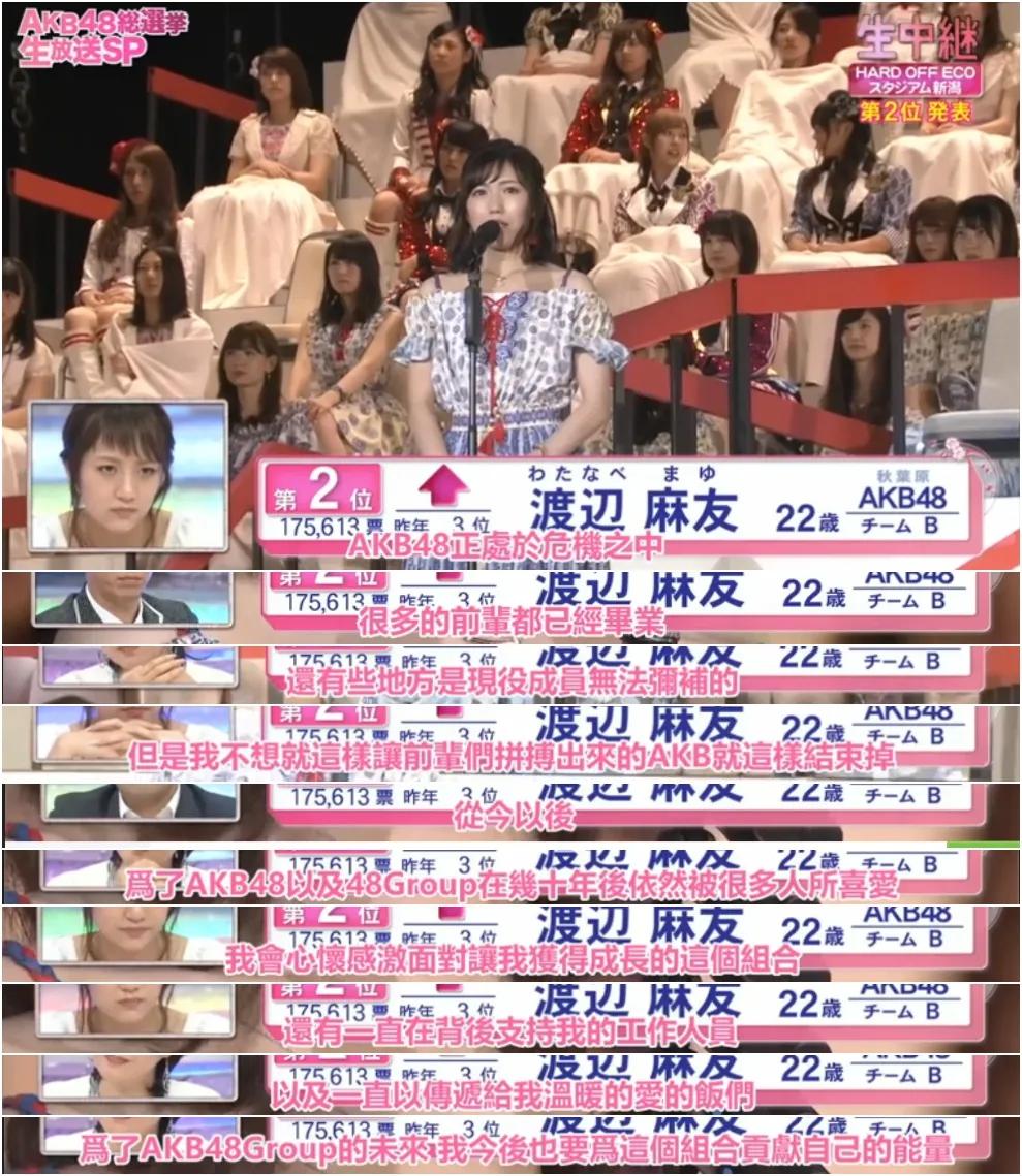 濒临解散之后,AKB48在2010年逆袭,人气高涨,在2011年被日本媒体称为“国民偶像”,渡边麻友也成为家喻户晓的人物,并且在2014年拿到了总选举冠军。