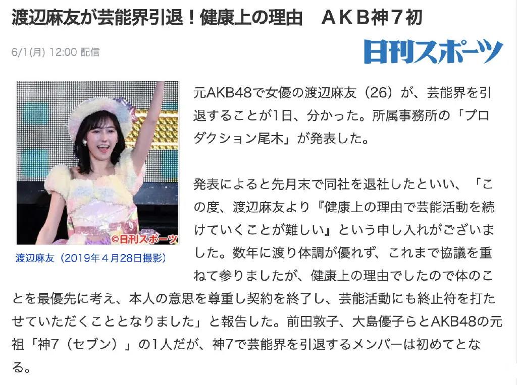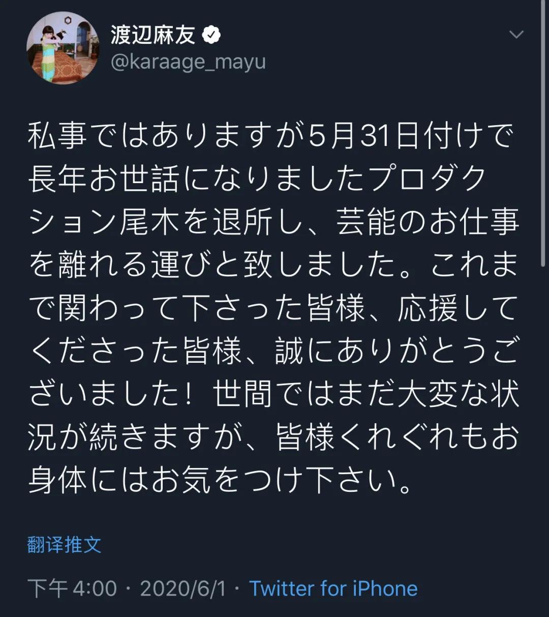 6月1日这一边,渡边麻友宣布退出娱乐圈