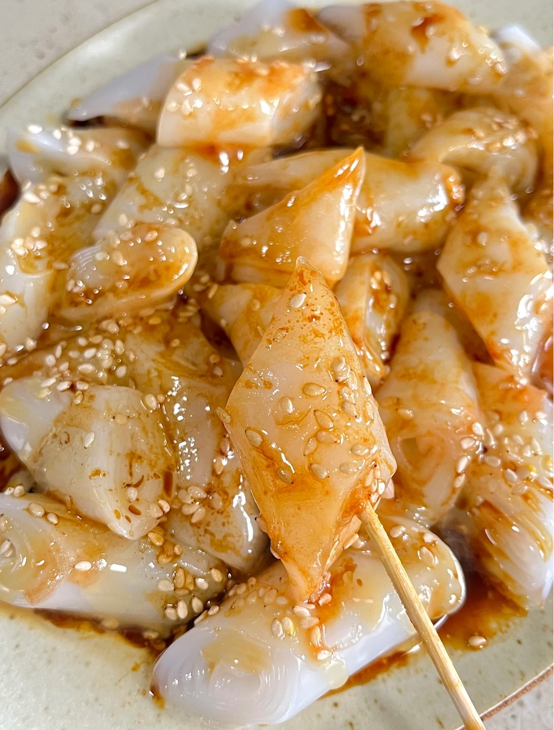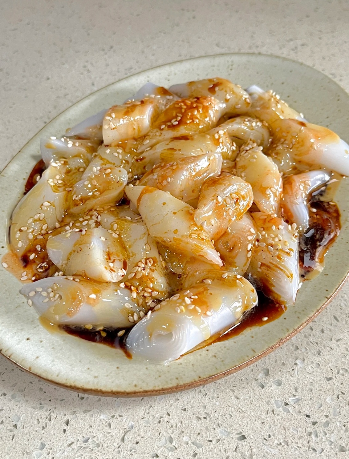 装盘装饰:将调味后的猪肠粉盛出,撒上白芝麻点缀,最后滴上几滴麻油提香。