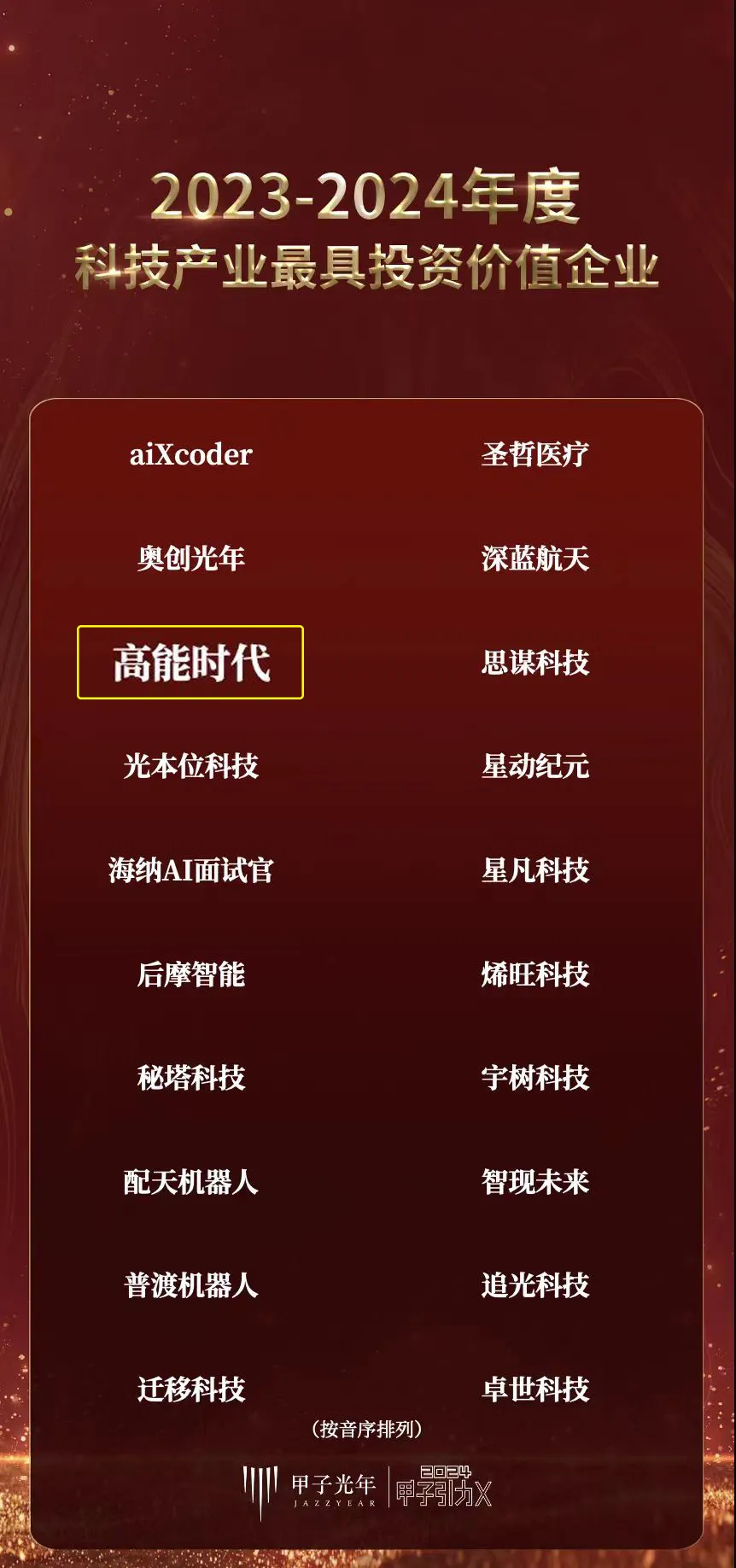 作为中国领先的科技产业智库,「甲子光年」深耕硬科技、智能制造以及数字化转型,跟踪产业发展最新动态,独立输出有价值的产业观点。榜单围绕新能源、半导体与集成电路、人工智能等产业,从品牌力、创新力、商业力、资本力、行业及投资人评价等多个维度对企业进行综合评定。凭借卓越的科技创新能力、产品研发实力及领先行业的商业势能,高能时代荣获2023-2024年度科技产业最具投资价值企业TOP20!