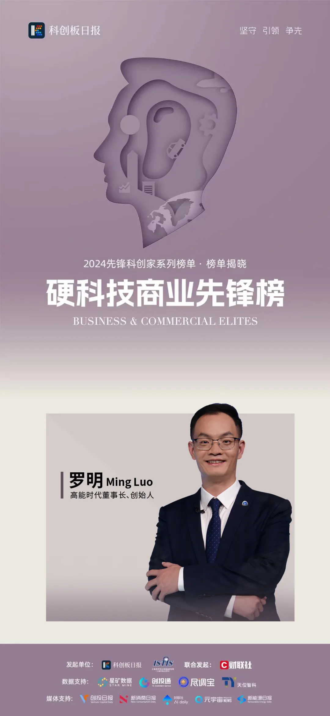 《科创板日报》由上海报业集团主管主办、财联社出品,是目前国内唯一专注科创板领域的专业媒体。本次榜单评选历时5个月,覆盖芯片半导体、生物医药、新能源、新能源汽车及智能驾驶、人工智能与数字经济等新兴产业及未来产业,参评者所在企业均是技术先导型企业,具备关键核心技术及强大自主创新能力,对产业转型升级及技术全球化合作有着深远影响。经过对参选者们领导力、科创力以及商业力等多维度评估,共评选出12位硬科技商业先锋。