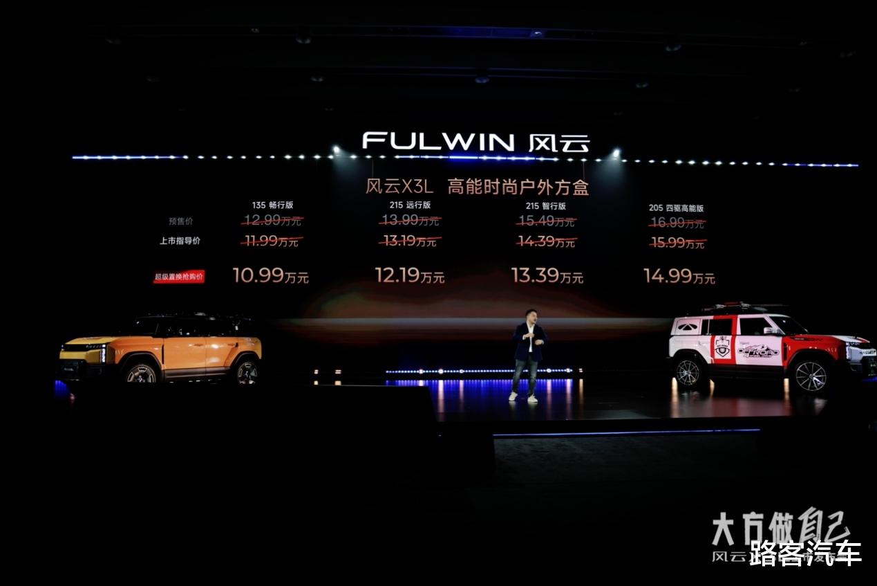 9月17日,风云X3L于成都举行上市发布会,正式售价为10.99万元起,共推出四个版本车型,135畅行版售价10.99万、215远行版售价12.19万、215智行版售价13.39万、205四驱高能版售价14.99万。同时,六大官改版型也惊艳亮相,释放终极个性,演绎方盒的无限可能。