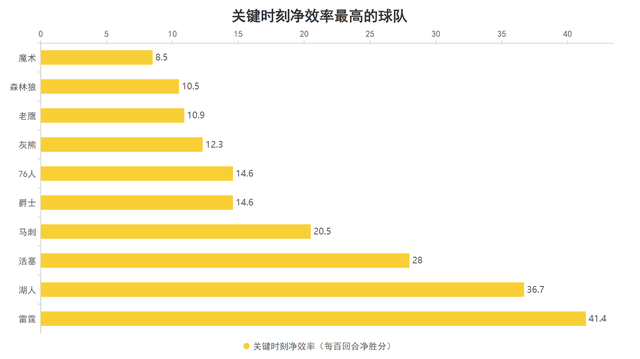 雷霆关键时刻的净效率达到了41.4,这意味着当比赛进入关键时刻雷霆每百回合可以净胜对手41.4分高居联盟第一,防守组成基本盘、亚历山大充当稳定剂加上关键时刻稳定的攻防表现共同铸就了这支历史级别的强队。