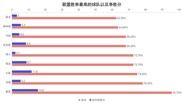 本赛季雷霆取得了22胜1负的战绩断档式的领跑全联盟,同时他们的场均正负值达到了联盟第一的+15.6,这意味着他们净胜分也高达联盟第一的15.6分,这也可以表明当雷霆赢不到16分时他们甚至都没发挥出正常的比赛水平。