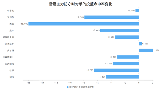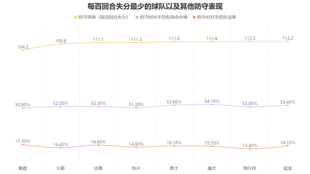 本赛季当雷霆防守对手时,对手的运动战也就是结合三分情况的有效命中率为联盟最低的50.9%,但同时对手的失误率高达联盟第一的17.3%,这意味着当对手面对雷霆的防守时会投出最低的运动战命中率还会出现最多的失误数,降准与迫使对手失误全部位于联盟最强也令雷霆每百回合的失分数为联盟最低。