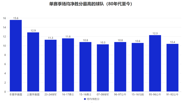 更为夸张的是,虽然目前赛季还未过半,但他们的场均净胜15.6分已经超过了73胜的勇士,甚至也是从1980年至今的最高,这意味着雷霆许多比赛都是以大胜收尾,球队的整体统治力达到历史级别。