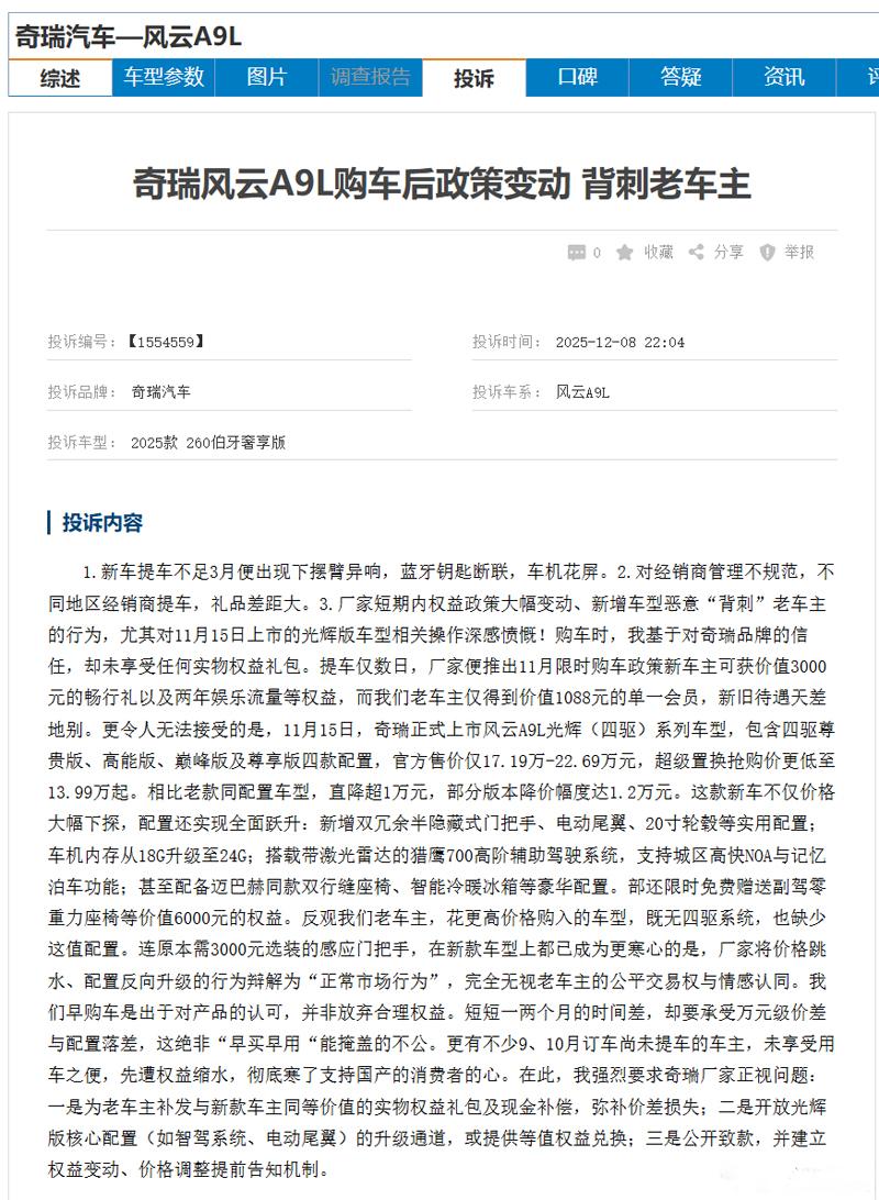 据第三方汽车投诉平台显示,奇瑞风云A9L近期被大量车主集中投诉,核心诉求围绕销售政策变动、底盘异响等问题展开。有投诉车主透露,新车提车不足3个月,便接连出现下摆臂异响、蓝牙钥匙断联、车机花屏等故障,此外不同地区经销商提车礼品差距悬殊,更让车主难以接受的是厂家短期内的权益和价格调整。