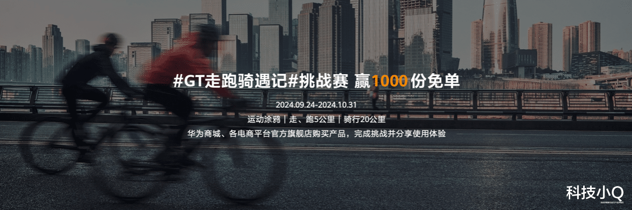2024年9月20日至2024年10月31日,在华为商城、各电商平台官方旗舰店购买产品的消费者,按照相应活动规则佩戴完成GT走跑骑遇记挑战,赢1000份免单!