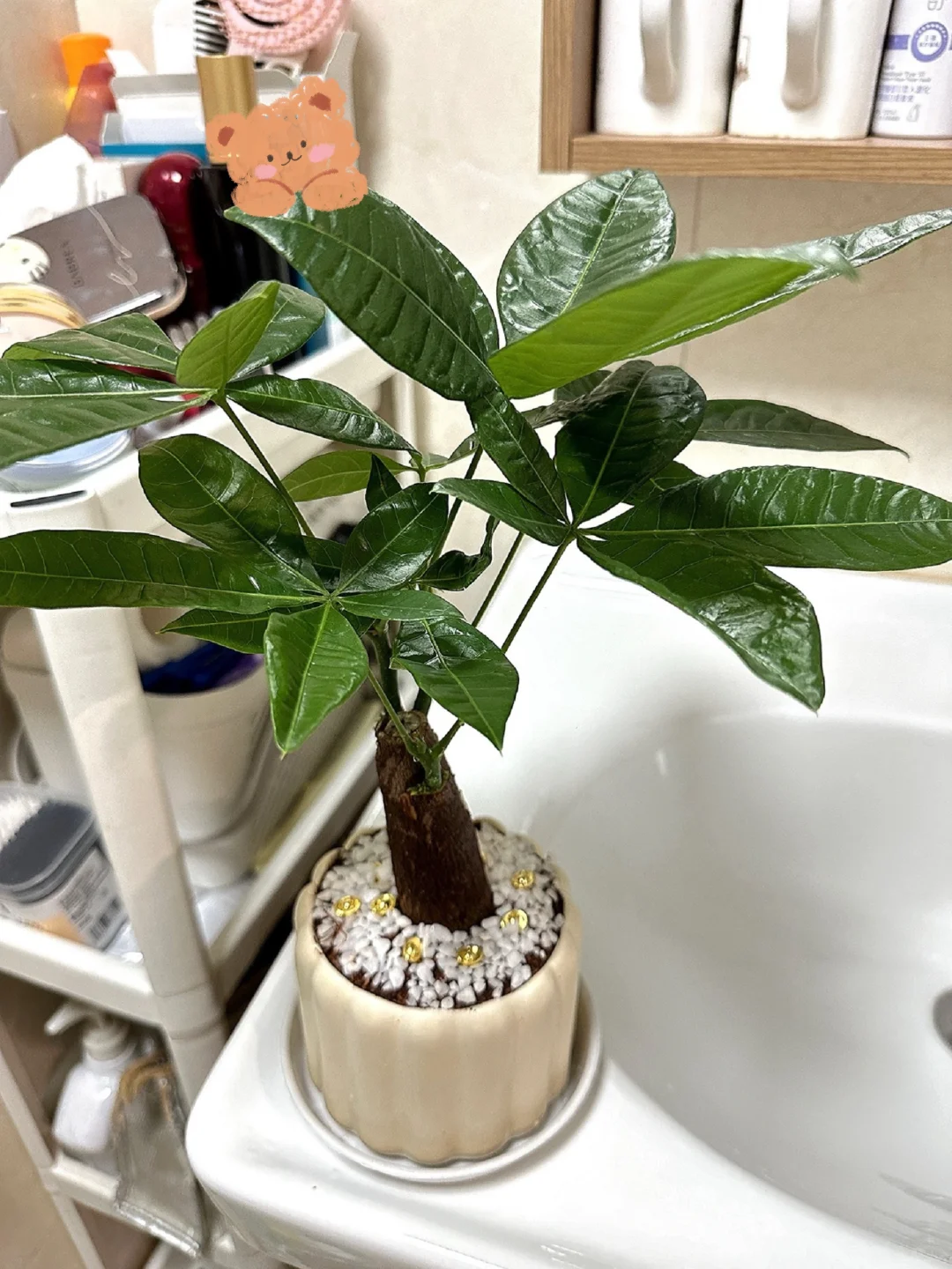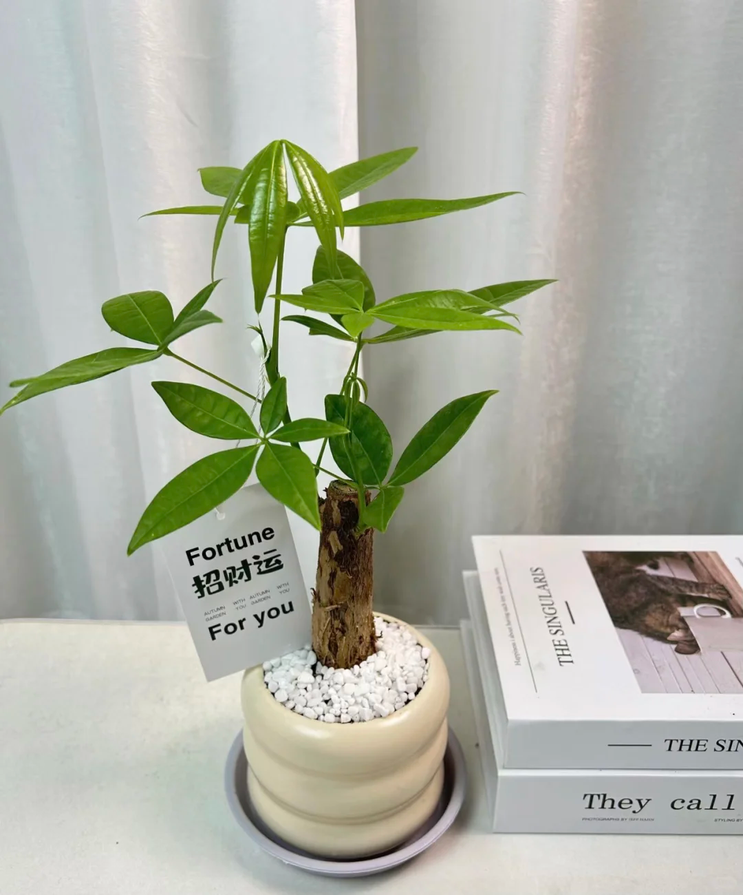而且每天除了要至少给予6小时以上的散射光之外,每周还要扭转180度盆栽,确保发财树的枝叶能均匀受光,匀称生长。