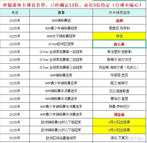以上是获得世锦赛外卡球员的表格,女子世锦赛冠军待定,因为旺哈鲁泰和白雨露已经是职业球员了,不需要以还卡的身份参赛,具体怎么选,目前还不清楚。另外还有欧洲锦标赛18岁以下冠军组和21岁以下冠军组,可获得外卡资格,以上的球员中,有获得了下赛季职业资格的,也有第一次被邀请参赛的,第一次被邀请参赛的球员,如果打的好,有机会破格录取,拿到职业资格。