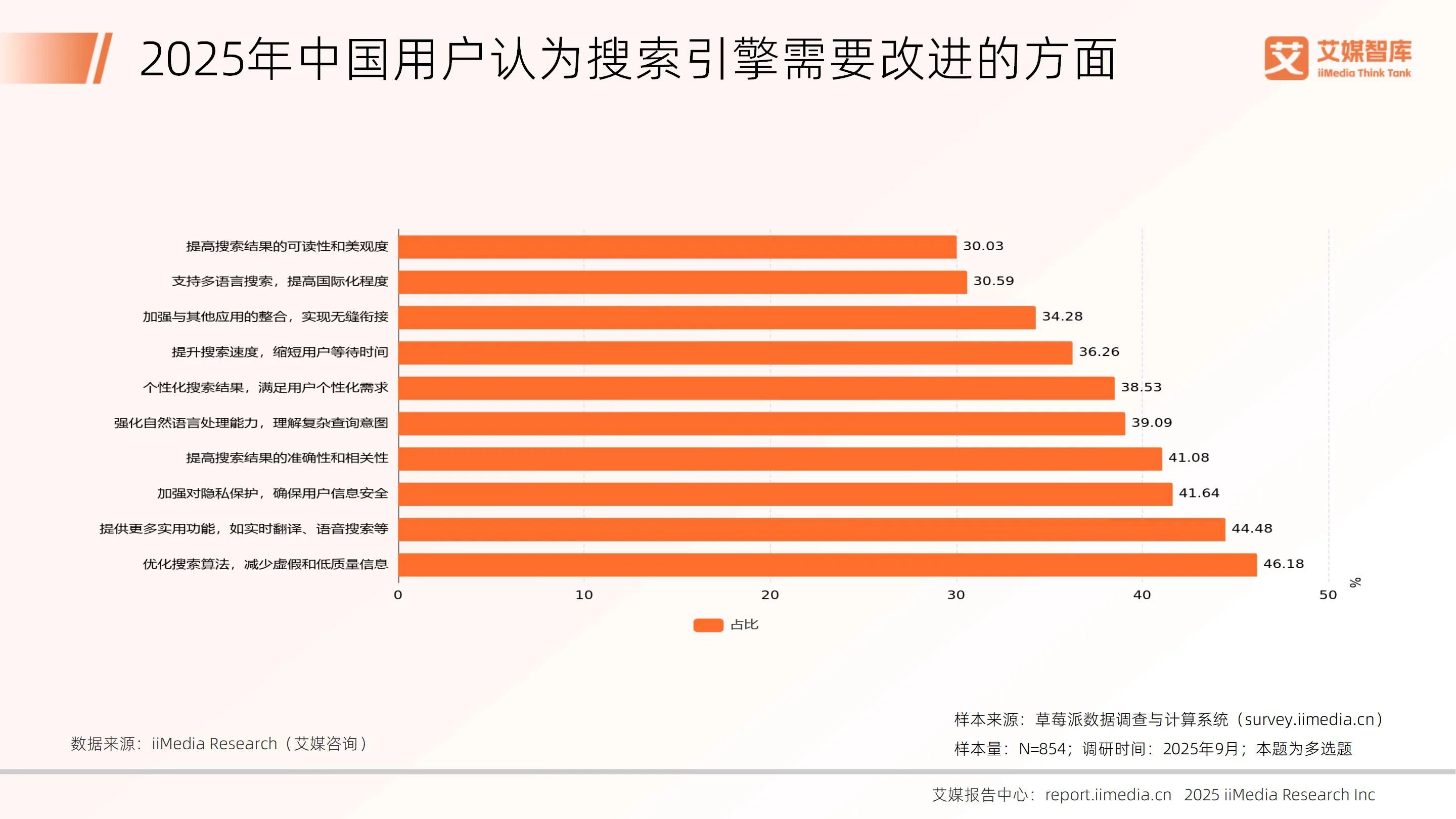 数据显示,在2025年中国用户认为搜索引擎需要改进的方面中,优化搜索算法以减少虚假和低质量信息的需求最高,占比达到46.18%。其次是提供更多实用功能,如实时翻译、语音搜索等,占比为44.48%。加强对隐私保护,确保用户信息安全,占比为41.64%,位列第三。支持多语言搜索,提高国际化程度的占比为30.59%,提高搜索结果的可读性和美观度的占比为30.03%,相对较低。艾媒咨询分析师认为,用户对搜索质量与实用功能的需求最为突出,平台需优先优化算法以提升信息真实性,并拓展语音、翻译等增值服务以增强用户体验。