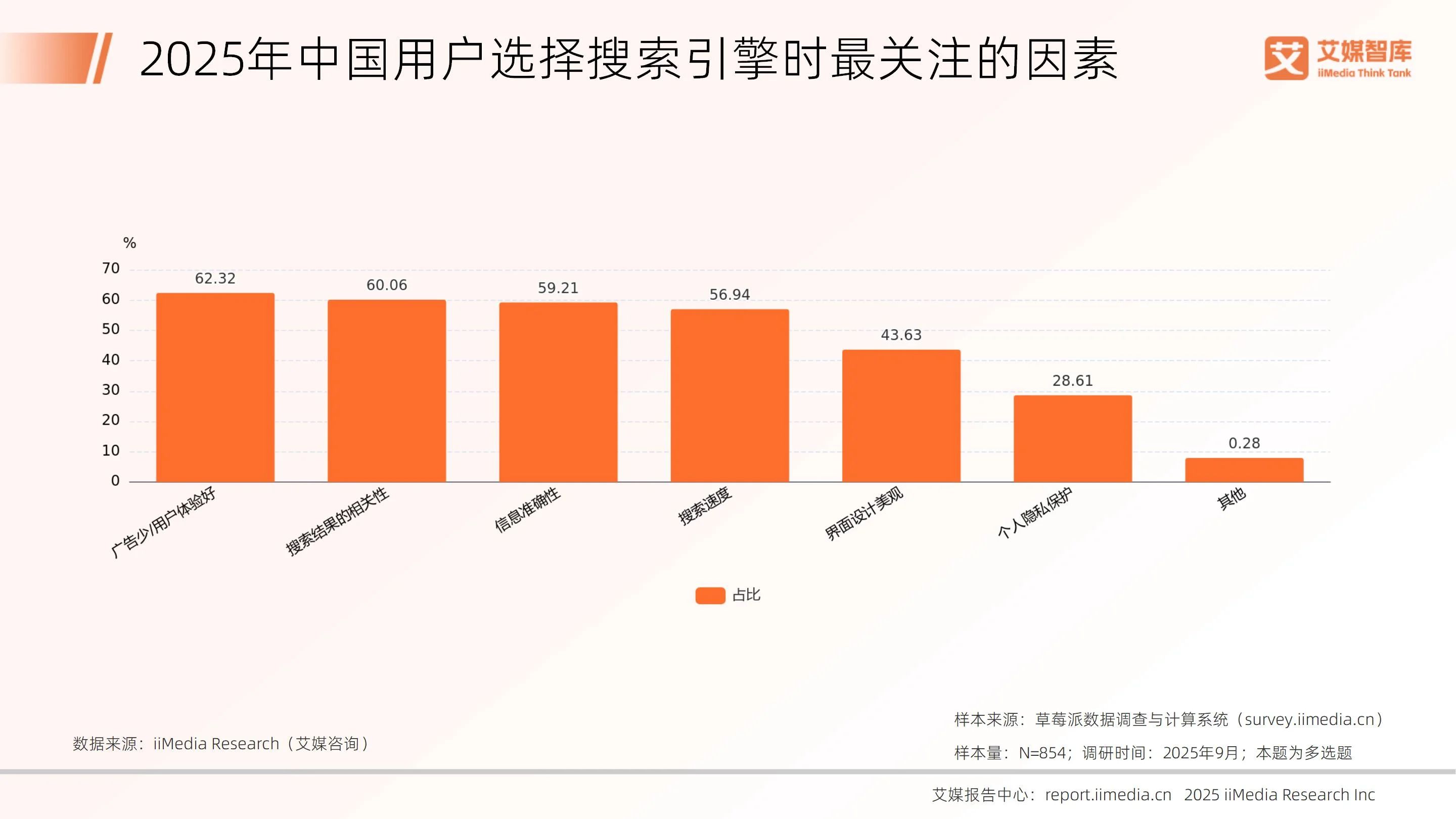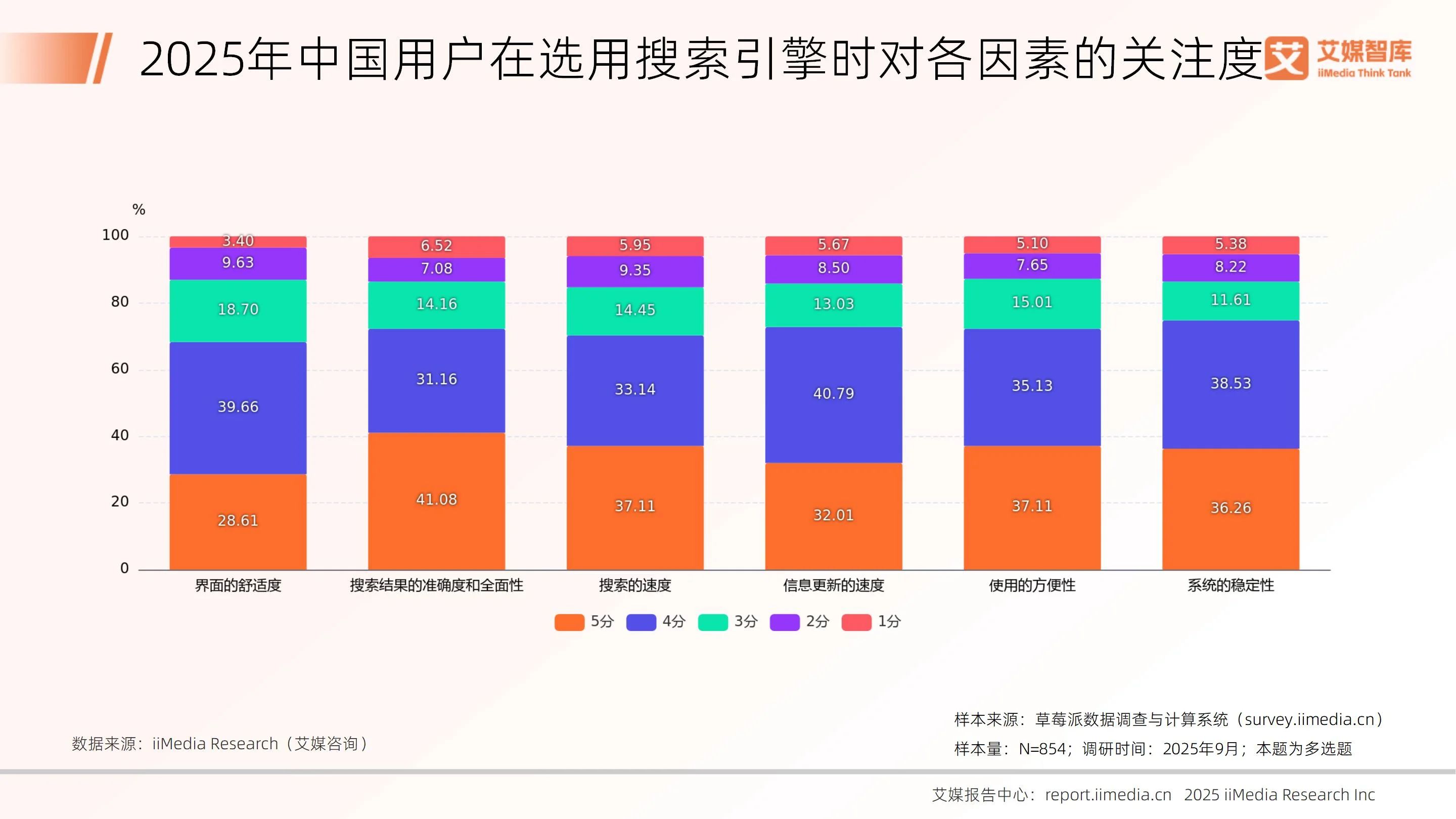 2025年中国用户在选用搜索引擎时对各因素的关注度
